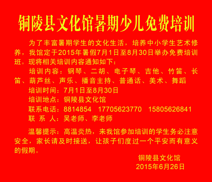 为提高我县广大青少年文化素质,丰富他们暑期生活,让他们在愉快的环境中感受文化的魅力,我馆于7月1日至8月30日举办暑期少儿培训班 ,培训内容有绘画、舞蹈、播音主持、声乐、电子琴、二胡、吉他、葫芦丝、笛子、钢琴等。